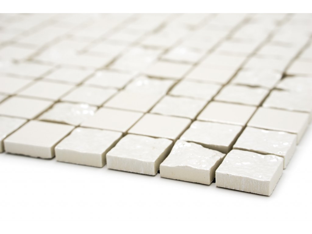 Exkluzivní glazovaná mozaika vytvořená japonskými designéry. Mix hladkých a reliéfních kostiček čtvercového formátu s jemnou perletí na povrchu.