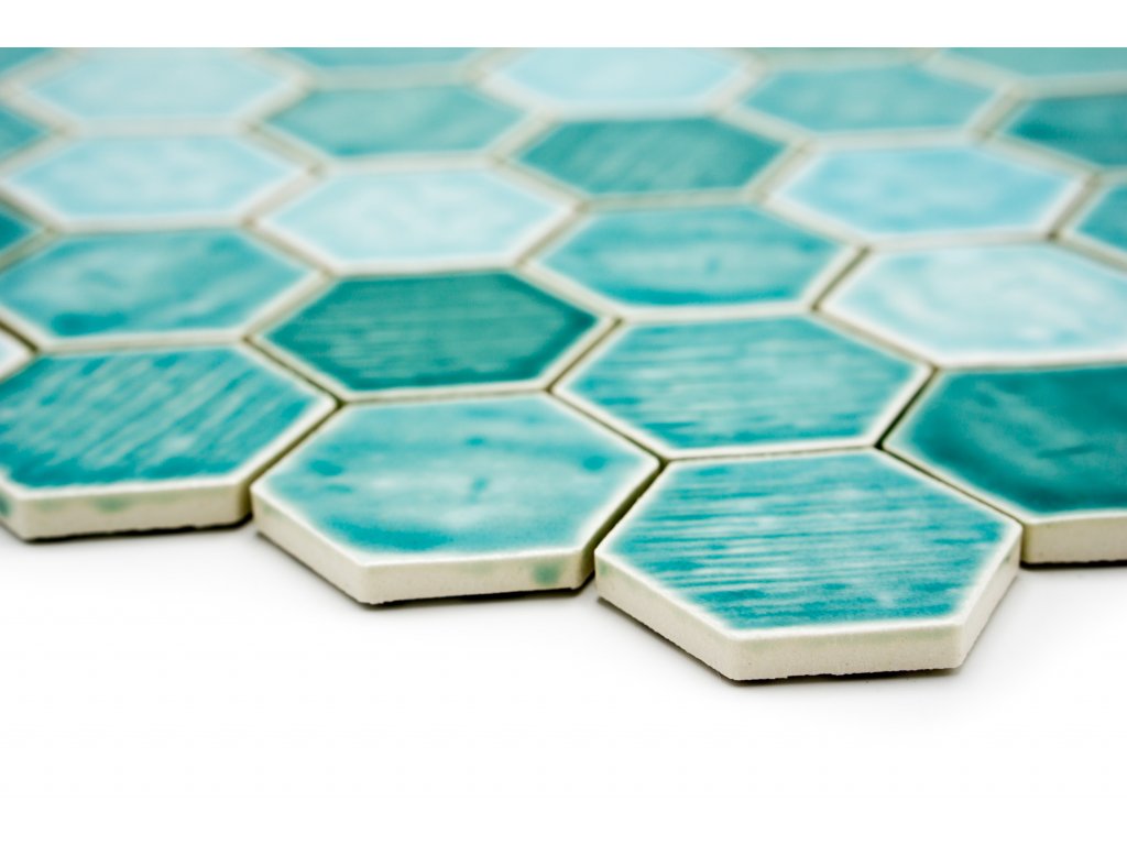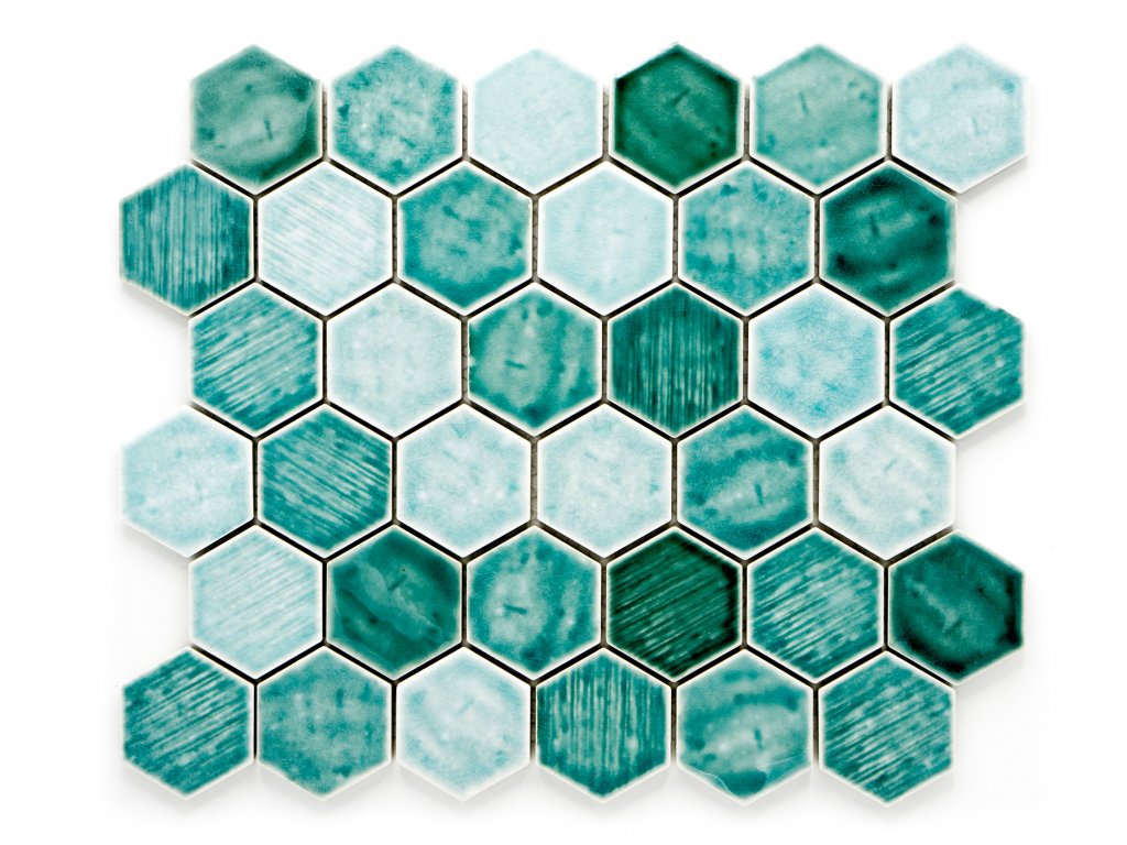 Exkluzivní glazovaná mozaika vytvořená japonskými designéry. Mix ručně glazovaných dílků šestiúhelníkového formátu s lesklým povrchem.